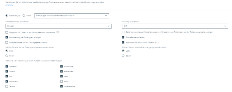 Einfache Modifikationen des Shop-Plugins können nun direkt im Cockpit erfolgen. Dies gilt für funktionale Einstellungen wie bspw. Standardsprache, Anzeige von Feldern zur Promocode-Eingabe, Abfragen von Kundeninformationen, Abhängigkeiten von Ticketkategorien etc.